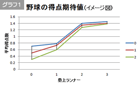 そこには、二塁に進塁させるとランナー一塁の時よりも得点期待値が飛躍的に伸びるのに対して、三塁へ進塁させてもそれほど得点期待値が伸びないからです。(単純にヒットによる得点に絞った場合)※グラフ1 |