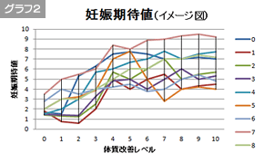 これらを妊娠期待値に当てはめると、グラフ2の様にすべての体質レベルを10まで前進させる事に時間をかけるより、体質レベルが4〜5に到達したら他の方法へ移行する事で、より幅広い可能性を試すチャンスが創出されて妊娠期待値が伸びると考えております。※グラフ2 |