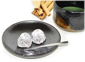 その「肉桂」を柔らかな求肥に練り混ぜ、小豆のこし餡を包み、新しい菓子として生まれたのが「肉桂餅(にっきもち)」です。「肉桂餅」はその歴史と 「わび」「さび」にも通じるセピア色の姿、千利休生誕の地、茶の湯発祥の地としての「堺」の歴史が生んだ伝統の和菓子です。 |