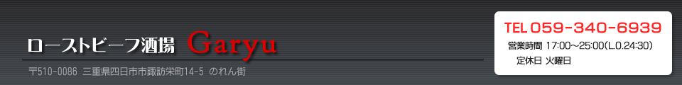 このローストビーフをメインに提供しているカウンターバー「ローストビーフ酒場 Garyu」が近鉄四日市駅に近い諏訪栄町に2016年5月オープン。 代表の父親が焼肉店を経営していることと、自身の焼肉屋勤務や和洋中その他ジャンルの料理店での修行経験を活かし、本人曰く“我流”のオリジナルソースを利かせた独自製法のローストビーフを完成させた。 他にも、珍しい牛タンローストビーフから家庭的な料理、ソムリエが厳選したワインなどの各種お酒も取り揃えている。昭和レトロな店内は落ち着く雰囲気でリピーターの方も多いらしい。気軽に色んなリクエストに答えてくれるそうなので興味ある方は訪ねてみては。 |